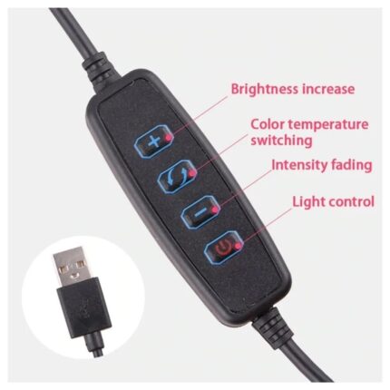 Aro de 26cm con modo de iluminación de 3 colores, blanco, amarillo cálido, blanco cálido. Cada modo de iluminación tiene 10 niveles de brillo, alimentación eléctrica es con cable USB.