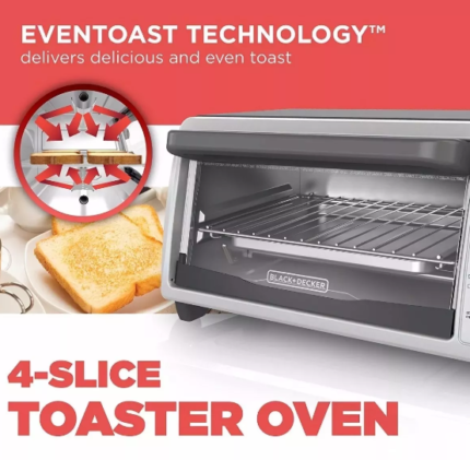 Este horno tostador BLACK + DECKER presenta la exclusiva tecnología Even Toast, que optimiza la distribución del calor interior para brindar pan hasta en un 30 por ciento más que los competidores líderes. Con su interior curvado, puede caber hasta 4 rebanadas de pan o una pizza de 9 ". La versatilidad de la cocina está justo en su mostrador con tostadas fáciles de usar, asar, hornear y mantener calientes las funciones y un temporizador de 30 minutos que cuenta una función de permanencia para tiempos de horneado más largos. Una luz indicadora de potencia y una señal audible "lista" hacen que cocinar sea aún más simple. Finalmente, la limpieza es muy fácil con la bandeja extraíble para una encimera sin desorden.
